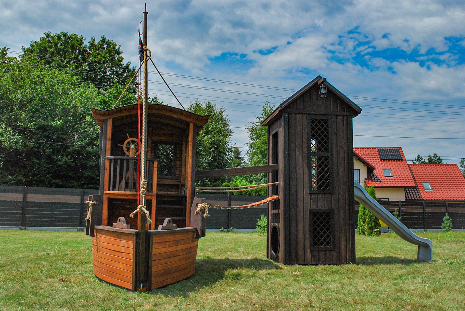 Konstrukcja wykonana jest z wysokiej jakości drewna, starannie obrabianego i zabezpieczonego przed warunkami atmosferycznymi. Dzięki temu plac zabaw doskonale sprawdza się zarówno w ogrodach prywatnych, jak i w przestrzeniach publicznych – takich jak przedszkola, szkoły, hotele czy ośrodki wypoczynkowe.